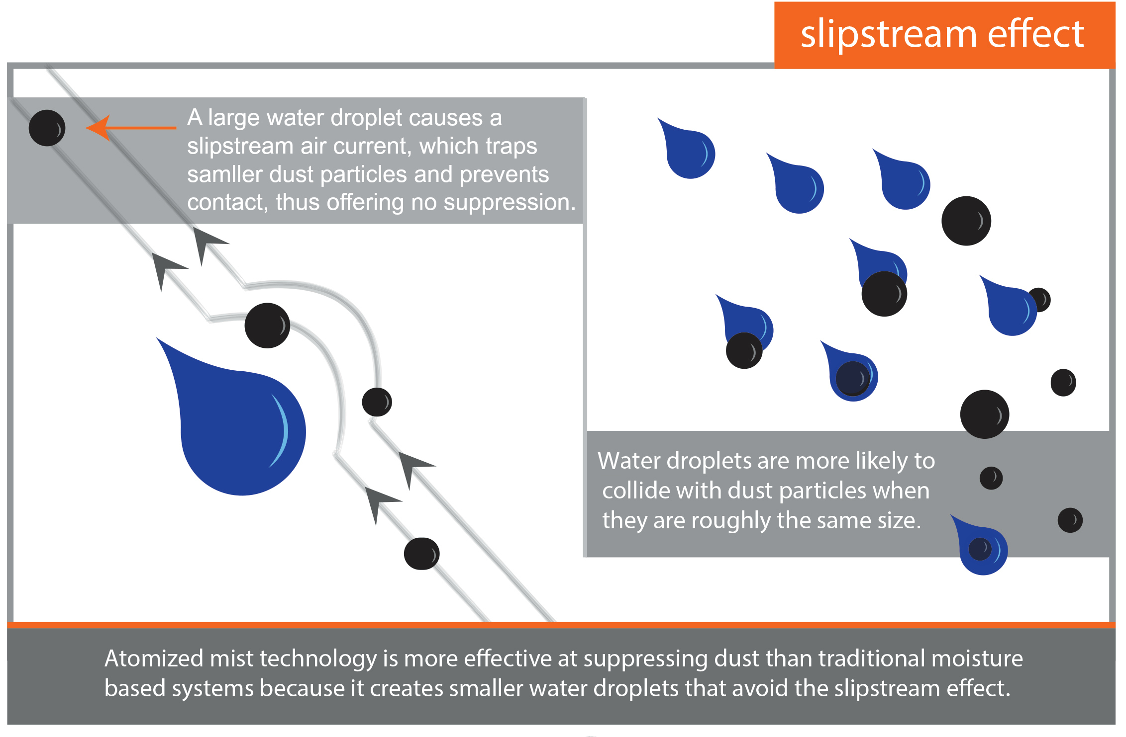 As airborne dust particles and water droplets approach each other, the best chance for a collision is created when they are roughly the same size, thus minimizing the slipstream effect.  Atomized mist technology introduces millions of droplets per minute into the area, increasing their chances of coming in contact with dust particles.