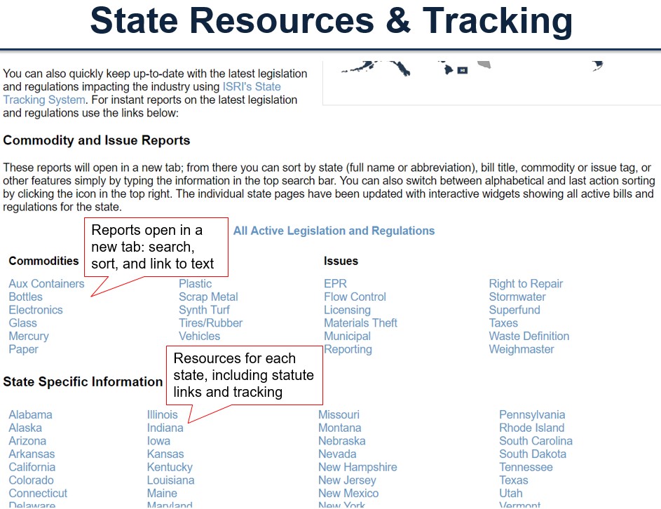 ISRI has compiled information on the laws affecting the industry in each state page, and we have added live reports of all active legislation and regulations for the 2018 session. You can also access reports impacting particular commodities, issues, and chapters from the main State Resources and Tracking page.