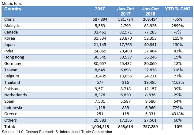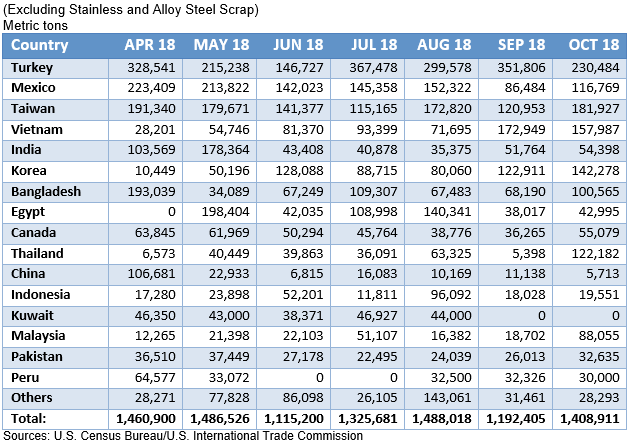 For the year to date (through October), Turkish demand for U.S. ferrous scrap was up 2% as compared to the first 10 months of 2017 to more than 2.9 million metric tons, according to Commerce Dept. trade data. But the data also show a slowdown in shipments to Turkey in October to just over 230,000 mt, down from more that 350,000 mt shipped in September.. However, improved trade flows with Thailand, Malaysia, Mexico, Taiwan, South Korea, and Bangladesh, among other, more than offset the October downturn in Turkish demand. For the Jan-Oct 2018 period, the official trade figures show U.S. exports of ferrous scrap (ex-stainless and alloy steel scrap) were up 20% year-on-year to nearly 13.4 million metric tons.