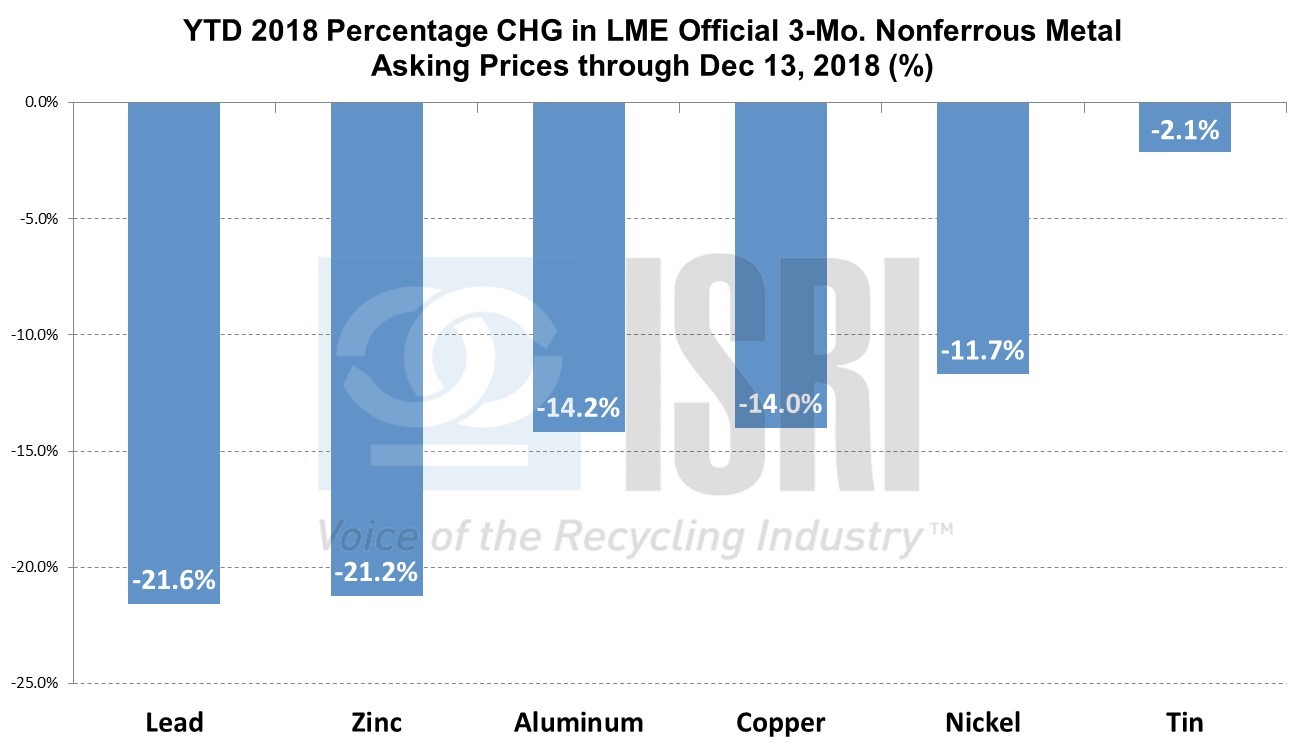 Nonferrous – Through December 13th, prices for the major nonferrous metal at the London Metal Exchange were all in negative territory as compared to the end of last year. Lead prices have been the worst performer this year (-21.6%) while tin prices have held up relatively (-2.1%) well.